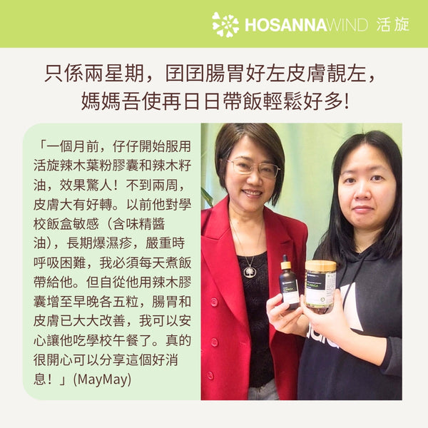 Taking HosannaWind Moringa Leaf Powder three times a day, my persistent dry cough for over a month was completely cured. Using the HosannaWind Moringa Throat Calming Oil, it loosened the phlegm, allowing me to cough it out, and I felt so much better.